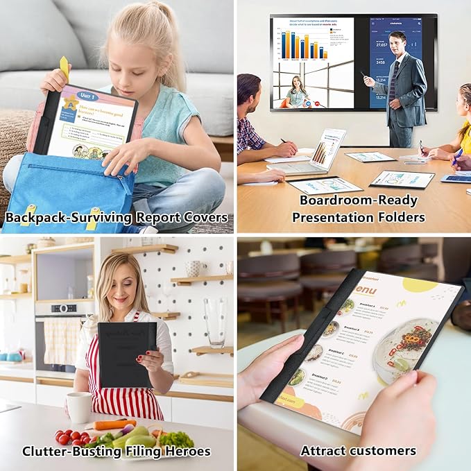 - Multi-purpose folder:Deployed in schools, corporate offices, medical facilities, homes, and retail spaces – these versatile folders streamline workflows by organizing reports for quick access, cut clutter as home filing heroes, and even shine as travel agency brochure holders or diner menu covers. One solution, infinite possibilities.