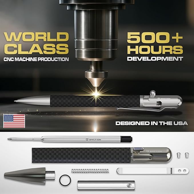 BASTION® Luxury Slim Bolt Action Pen, EDC Pen with Fine Tip, Professional Ballpoint Pen for School and Work - Carbon Fiber-Stainless Steel
