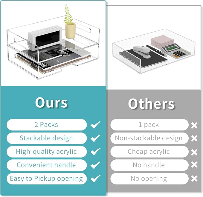 - 2 Pack Acrylic Paper Tray: Each package come with 2 pack horizontal stackable tray which measures is 8.7x12.3x2.7 inches.