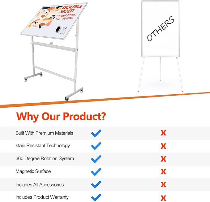 - COMMERCIAL QUALITY DRY ERASE BOARD - Our large magnetic rolling white board is made of the highest quality materials, which is lightweight and sturdy at the same time. It has strong ABS corners and solid frame construction, so that this rolling whiteboard will not shake during use.