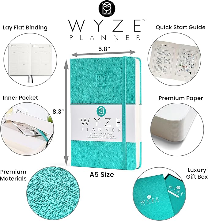 Undated Daily Planner – 3-Month A5 Productivity Organizer with Full Page Per Day, Hourly Schedule, Goal Setting, Habit Tracker, Weekly & Monthly Pages – Hardcover Time Management Notebook (Turquoise)