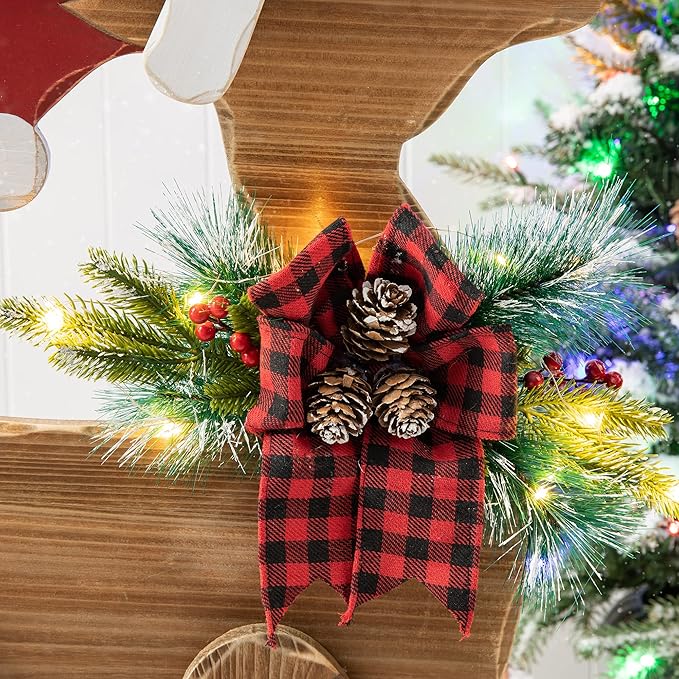 - UNIQUE RUSTIC DESIGN: Upgrade your holiday decor with this Chunky Wood Reindeer Porch Decor! 3D Reindeer decors with a red hat and plaid bow tie, making it the perfect Christmas decoration for your porch or living area. It's LED bulbs to brighten your porch and weathered wood texture provides a sense of retro style. You'll love coming home each night to a beautiful sight and a touch of Christmas in your porch.