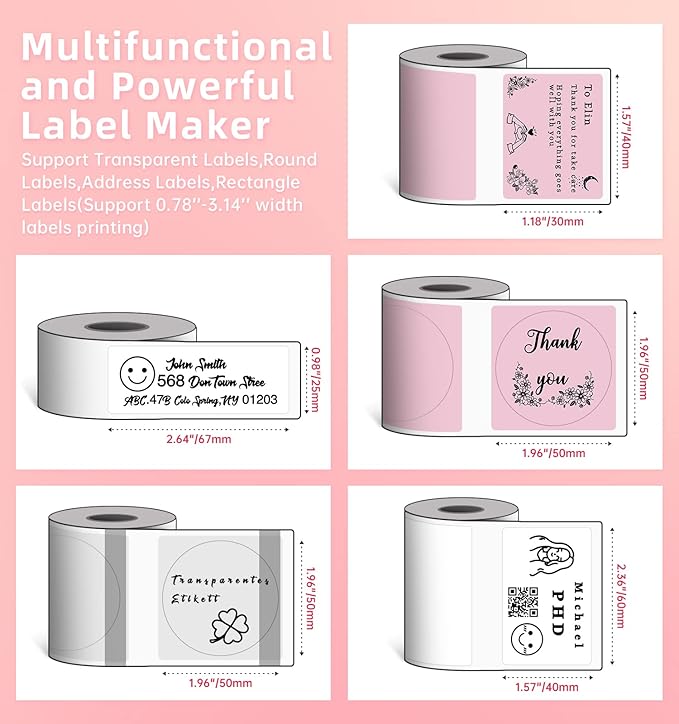 - Thermal Label Maker Printer: Phomemo m220 label maker use direct thermal thechnology, print without ink,toner. Keeping your labels clean, clear.This portable label maker come with 3 rolls labels. (1 Roll 40x30mm black in white label, 1 Roll 40x 30mm rectangle pink label, 1 Roll 50x50mm round pink label )(Attention: The label maker only support printer 0.78''-3.14'' width labels, can't support print 4 x 6 labels)