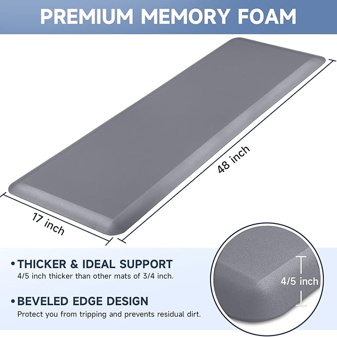- 【Thicker Mat】The StepRite kitchen mat is made of 4/5 inch thick memory foam for better support and comfort when standing. Measured as 17*47 inches. Suitable for kitchen, office, laundry room or any high-traffic area.
