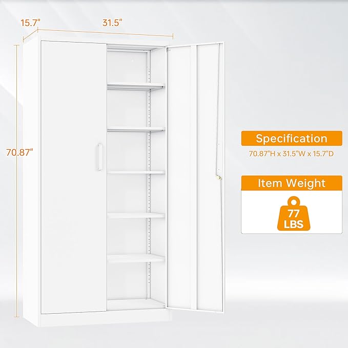 STANI Metal Garage Storage Cabinet with Lock, 71" Steel Lockable File Cabinet, Locking Steel Storage Cabinet with 5 Adjustable Shelves for Home, Office, Warehouse, Garage, School (White)