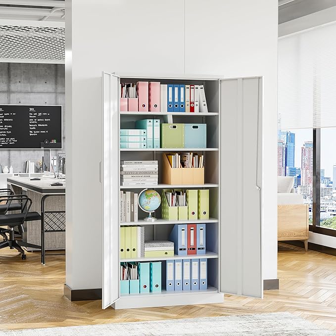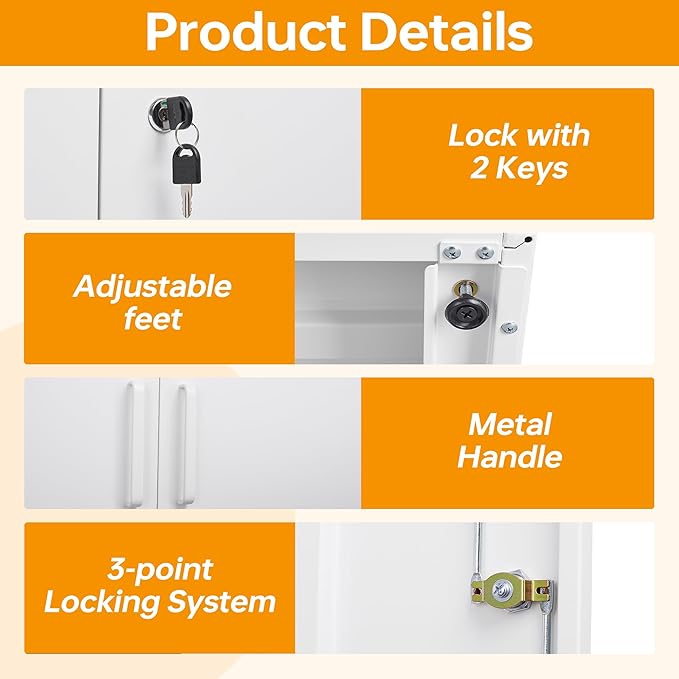 - 【Practical Design】This tall metal cabinet equipped with lock and 4 adjustable shelves to provide adaptability and convenience. 4 pre-holes on the back, help cabinet be mounted to the wall, prevent tipping.