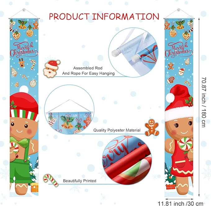 - Christmas Themed Design: this Christmas porch sign banner is designed with Christmas elements, including gingerbread, Santa Claus, snowflakes, candy canes, elk, Christmas bells and more, and is printed with blessings, which is colorful and eye catching, and decorating your house with it can grab everyone's attention