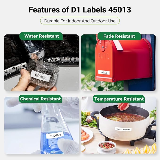- Features: Compatible for Dymo d1 45013 Label Maker Refills Tape are Water resistant, Grease resistant, Abrasion resistant and Fade resistant.