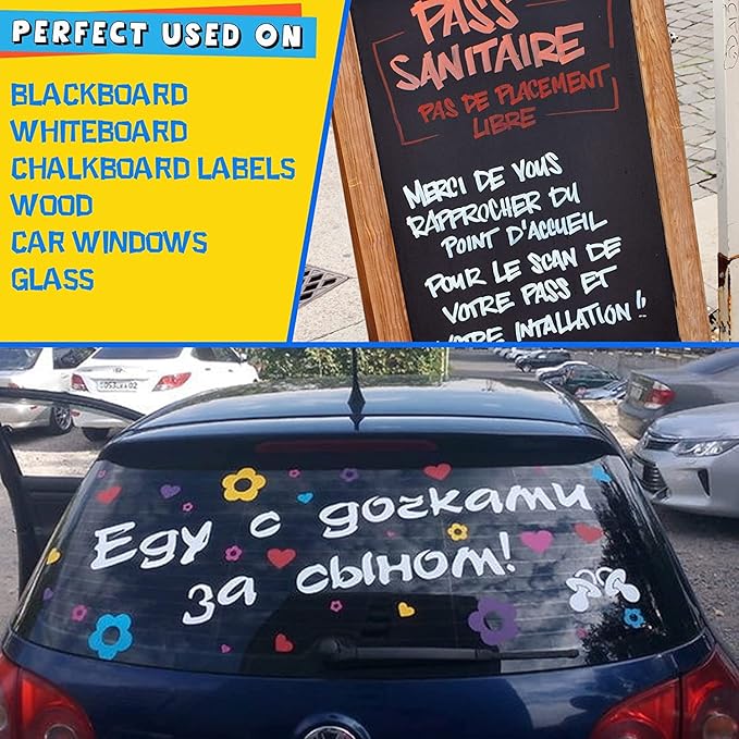 - Wide application - Dates on restaurant menu boards, car windows, children's art, calendar, bistro boards, whiteboards, window and mirror markers, LED writing boards, school and office projects, light panels, glassware, plastic products, metal products, kids' glossy chalkboard, food containers, ceramic mugs, chalkboard contact paper, chalkboard labels, thank you stickers, wall decals, etc. You are free to use your creativity.