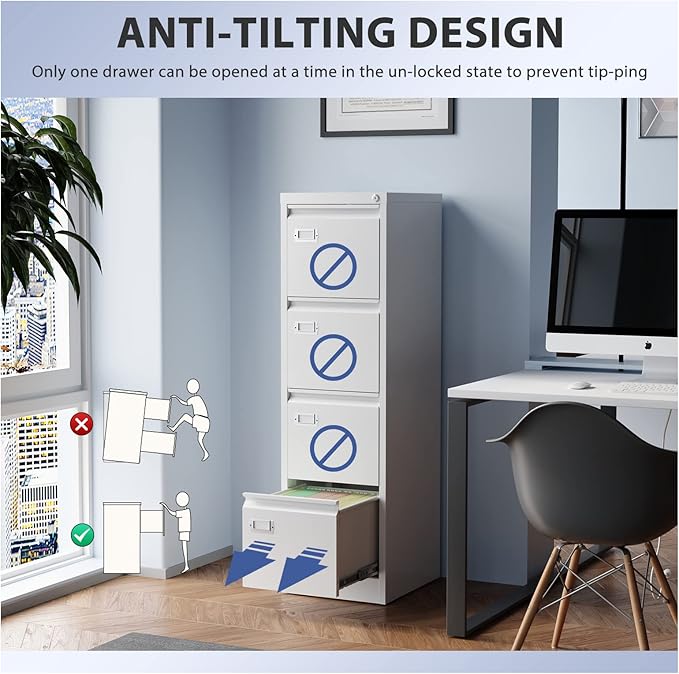 - 【Anti-Tilt Design】This office file cabinets has a lock that can lock all four drawers and comes with two keys. It helps you keep your valuables and documents safe. In the unlocked state, only one drawer can be pulled out at a time, preventing the movement of multiple drawers causing the overall center to shift and the box to fall.