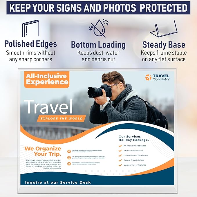 - Stable Self-Standing Design: Featuring a robust, 3-inch wide base, this acrylic sign holder provides exceptional stability. Whether placed on a table, busy counter, or high-traffic area, it remains firmly upright without requiring any extra support, ensuring your displays are safe from accidental bumps or falls. Ideal for business, events, or home use, its durable construction gives you peace of mind, offering a professional and secure way to showcase materials in any environment