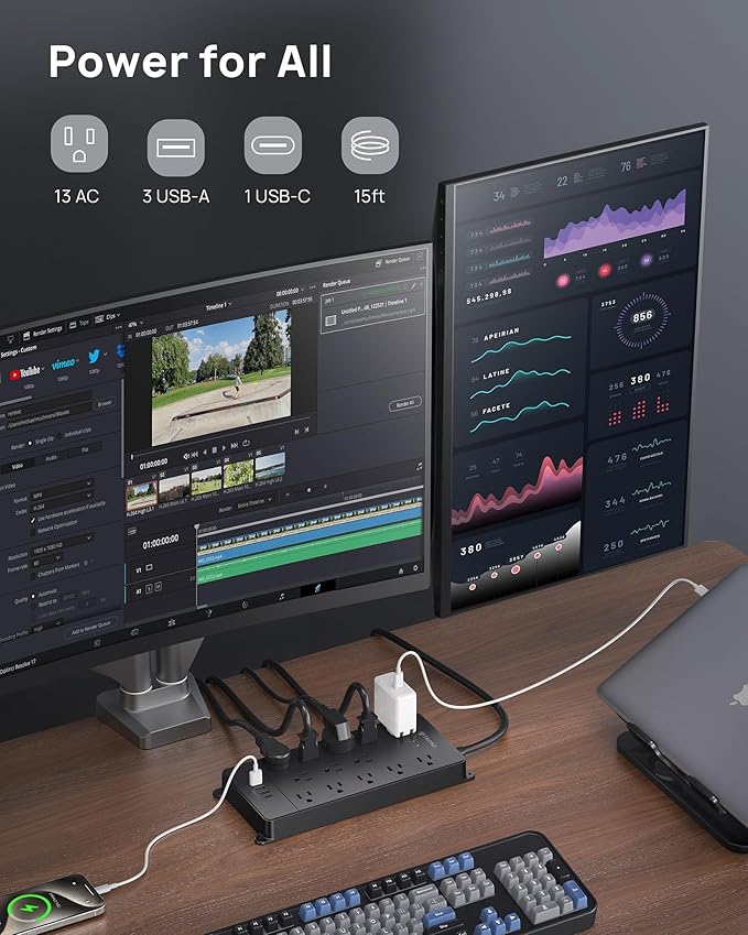 - Wall mountable design - 4 screw-mounting tabs allow you to securely install this surge protector power strip in various applications, including the entertainment center, behind the TV, dorm room, guest room, garage, desktop, under desk/counters, workbenches, etc.