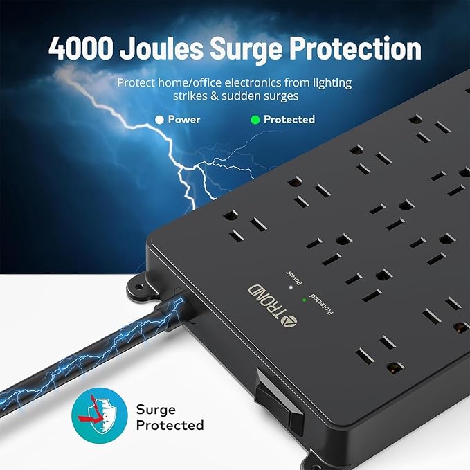 - 【8-Point Safety System】ETL certified and combined with 4000 Joules surge protection, short circuit protection, overload protection, fire resistance shell and more to defend your computer, TV, phones and other household office electronics against dangerous surges, spikes & lightning