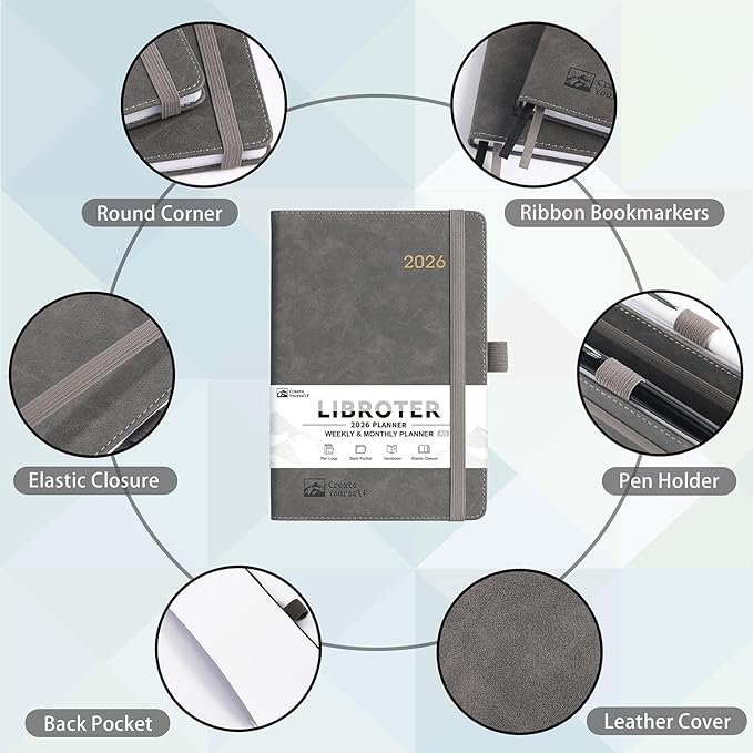 2026 Planner - Planner 2026, 2026 Weekly Monthly Planner, Jan.2026 - Dec.2026, 5.7'' x 8.4'', Thick Paper, Leather Cover, Pen Holder, Back Pocket, Bookmarks, Perfect Daily Organizer - Brown - Grey