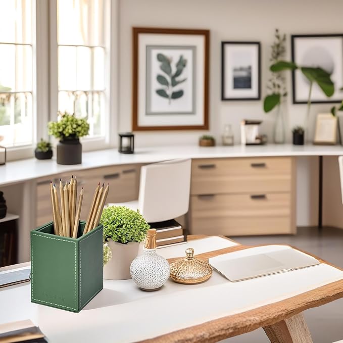 UnionBasic Square Pens Pencils Cup Holder Desk Stationery Organizer, Selected Faux Leather, Malachite Green