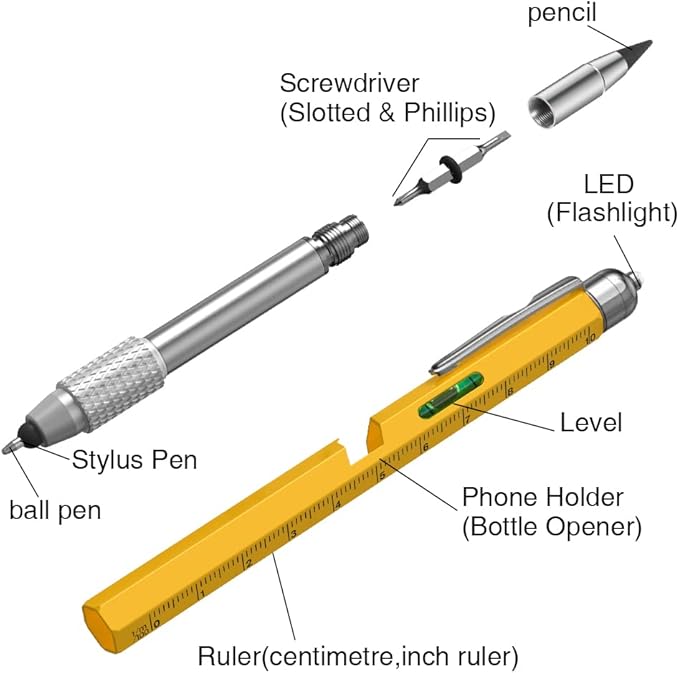 - 10 In 1 Multitool Pens - The original multitasking ballpoint pen from hongred, planning aid and tool box in one, tool pen, centimetre and inch / screwdriver (flat & phillips)/ballpoint pen/the eternal pencil/stylus and bottle opener (can act as phone holder)/ spirit level (diameter: 10 mm) - Overall dimensions: 190 x 10 mm diameter - packed in high-quality gift packaging (3 additional black ink refills and a set of spare batteries.)