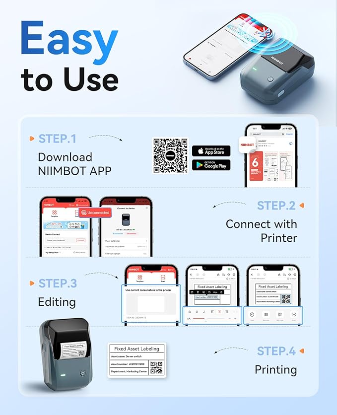- 【Easy Bluetooth Connectivity & User-Friendly】The NIIMBOT B1 Bluetooth label printer works seamlessly with both iOS and Android devices. Simply:① Download the "NIIMBOT" APP②Select "B1" as your printer model③Connect via Bluetooth in seconds. For PC use: Connect via USB cable (driver available on Niimbot's official website)
