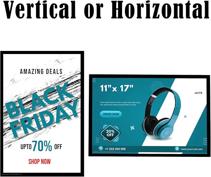 - Magnetic Sign Holder: JIUYE 11 x 17 sign holder is made of two layers of plastic frame,strong magnetic strips borders help fixing inner poster. Each package contains 5 pcs magnetic frames.