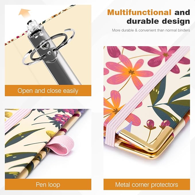 Ospelelf 3 Ring Binder, 2 Inch Letter Size (11" x 8.5") with 5 Tab Dividers, File Folder Labels and Low Profile Clipboards, Floral Binder for School and Office Supplies