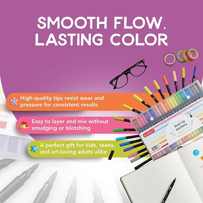 - VIBRANT DUAL TIP MARKERS — Includes 24 assorted colors with dual brush and fine tips, perfect for coloring, shading, and detailed drawing.