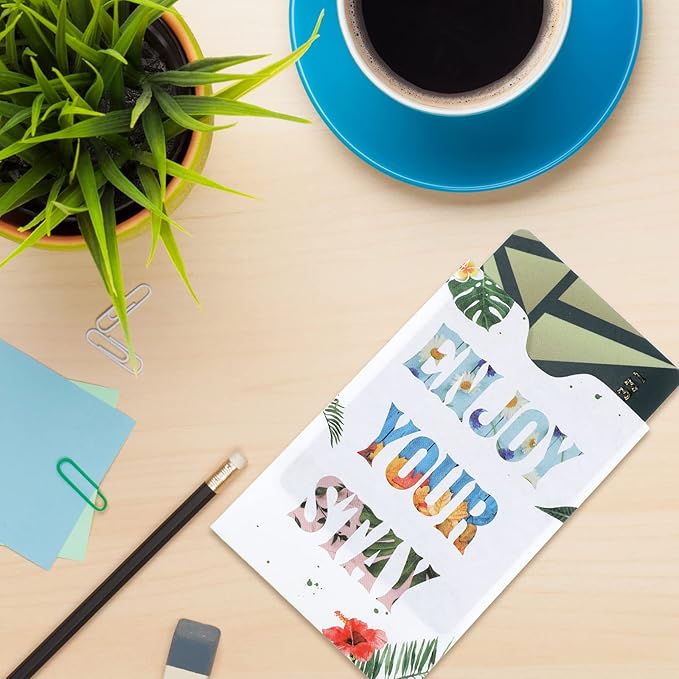- Delicate Design: hotel key card holder is designed with deep curves for thumb, enabling guests to slide in or out cards effortlessly without inserting fingers into the envelope; The floral prints and colorful words also add a trace of elegance
