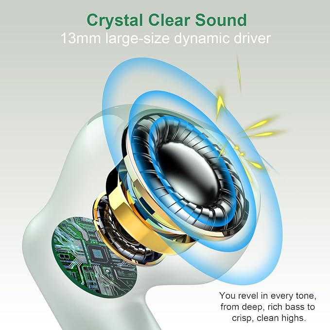 - The impressive Hi-Fi stereo sound and clear call: The wireless headphones feature 13mm drivers that boost quality sound with deep bass and mids at optimal levels that are pleasing to the ears. You will feel like an immersive concert. The built-in mic in each bluetooth earphones utilizes call noise cancellation to ensure clear and realistic sound. It will allow you to enjoy high-quality conversations anytime, anywhere.