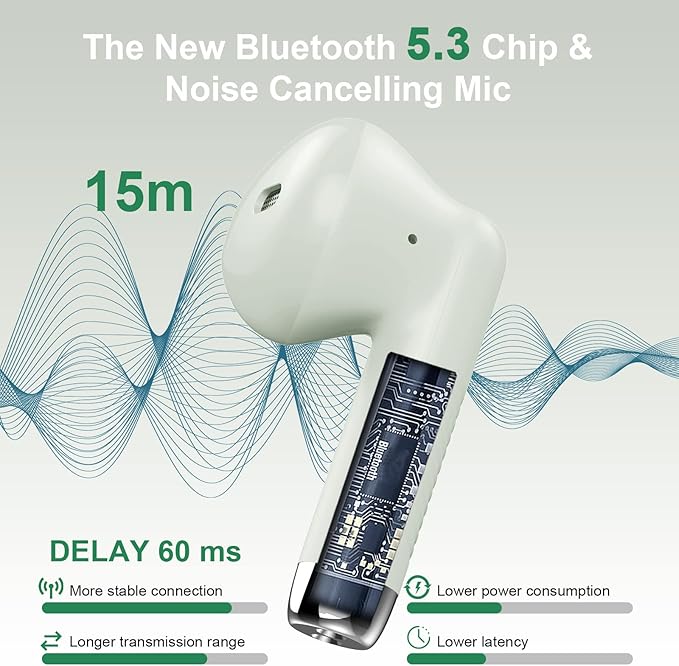 - Bluetooth 5.3, effortless pairing: the advanced Bluetooth 5.3 technology delivers a stable, low-latency wireless connection for high-quality sound(music or call). Also, the Bluetooth earbuds can connect automatically to the Bluetooth of your mobile phone when you open the charging box, avoiding complicated operations and saving waiting time.