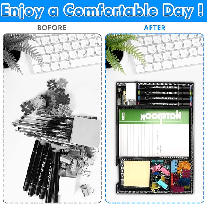 - >>Space Saving and Well Organized Desk Organizer- The 5 different size grid meet different need of different stationery or different size stuff need to storage no matter it is small or big, create a neat and well organized desktop environment.