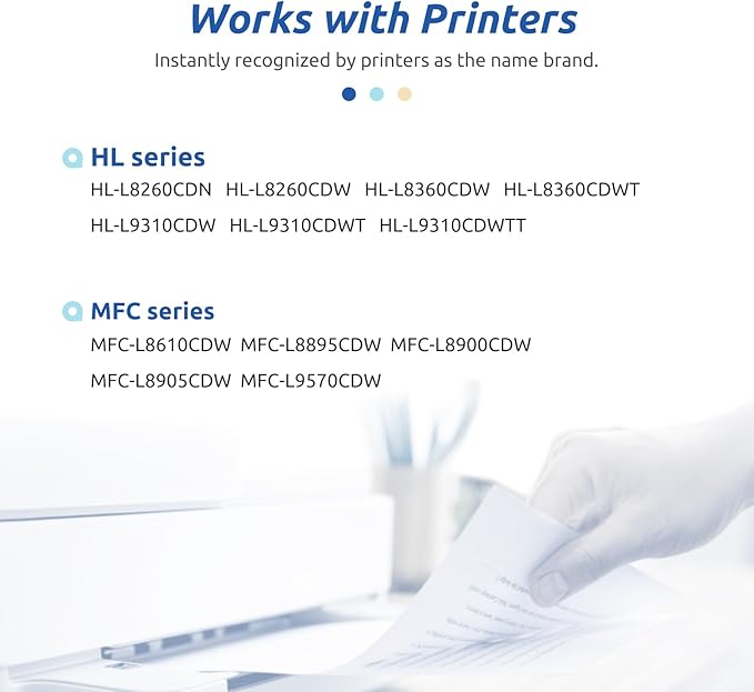 - Compatible with Brother Color Printer: HL-L8260CDW HL-L8360CDW HL-L8360CDWT HL-L9310CDW HL-L9310CDWT HL-L9310CDWTT DCP-L8410CDW DCP-L8410CDW MFC-L8610CDW MFC-L8690CDW MFC-L8900CDW MFC-L9570CDW MFC-L9570CDWT MFC-L8690CDW
