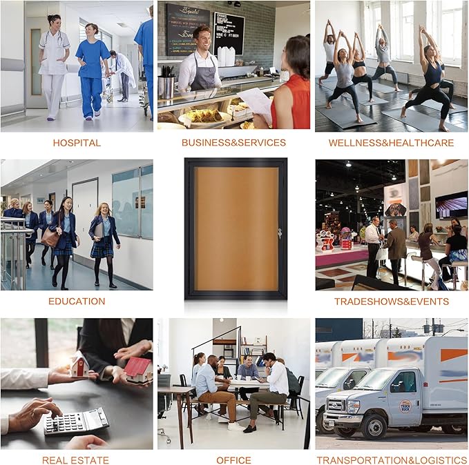 - HIGH-QUALITY MATERIAL:It is made of cork pin board, waterproof aluminum construction, shatter-resistant acrylic door and aluminium-plastic panel