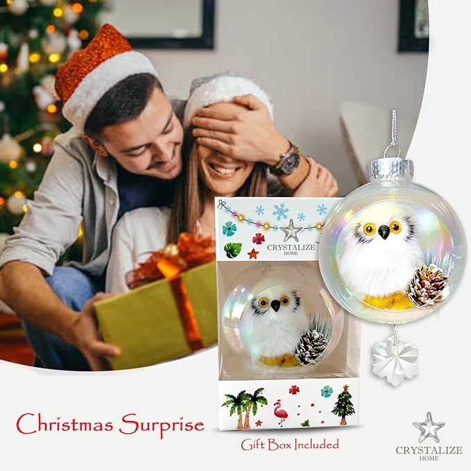 White Owl Christmas Ornament - Handmade Shatterproof Decorations for Indoor Outdoor Xmas Tree - Clear Ball Ornaments with Magnetic Crystal - Great Gift or Stocking Stuffer for Mom, Sister, Friend