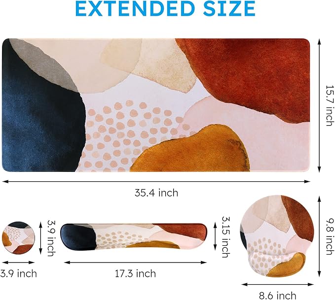 - Large Mouse Pad Size: Extended mouse pad:35.4" x 15.7",wrist rest for computer keyboard:17.32" x 3.15" x 0.98",wrist rest for mouse:8.66" x 9.84" x 0.86",Coaster:3.93" x 3.93"