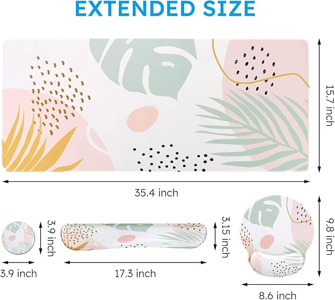 - Large Mouse Pad Size: Extended mouse pad:35.4" x 15.7",wrist rest for computer keyboard:17.32" x 3.15" x 0.98",wrist rest for mouse:8.66" x 9.84" x 0.86",Coaster:3.93" x 3.93"