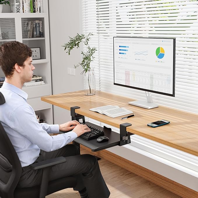 - ✅ MAXIMIZE YOUR DESK SPACE – Free up your desktop by placing your keyboard and mouse on this smooth slide-out tray. The ergonomic position helps reduce wrist strain while keeping your workspace tidy—perfect for offices, remote workstations, and gaming setups