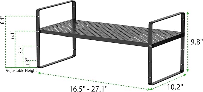 - Adjustable Shelves:This cabinet shelf organizer extends in length and adjusts in height to fit any space you need. The original shelf (collapsed) measures 16.5" L x 10.2 " W x 9.8" H. The length can be extended from 16.5 inches to 27.1 inches. This expandable cabinet shelf provides three levels of board height adjustment from 5.7 inches to 8.5 inches. You can tailor each shelf with adjusting screws on both sides of the shelf frame.
