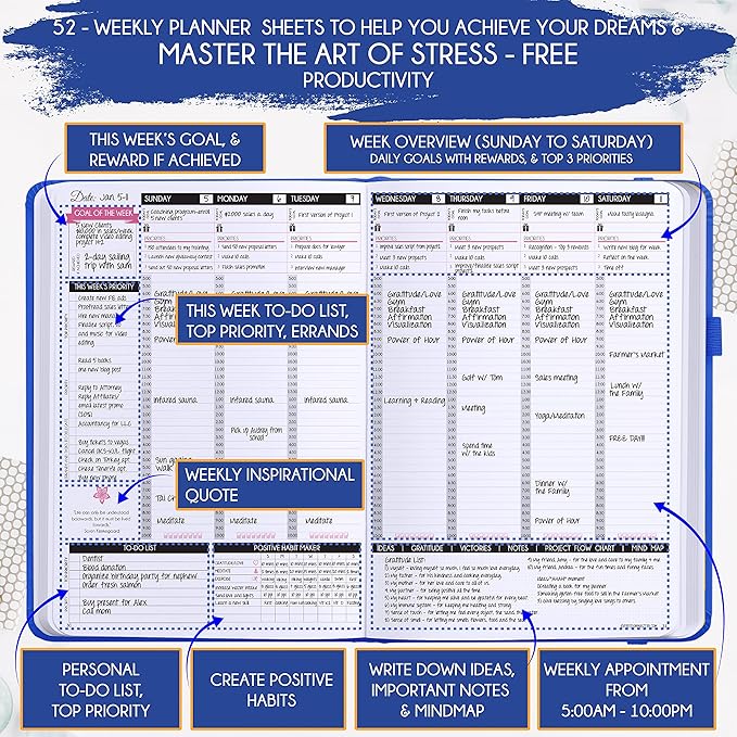 - INCREASE PRODUCTIVITY AND HAPPINESS - This is a deluxe life goal planner showing you how to become the best possible version of yourself on a mental, physical & interpersonal level using the law of attraction vibration guide. This 2024 planner is a daily planner, monthly planner, weekly planner, productivity planner, goal planner, business planner, to do list planner, planner notebook & gratitude journal all-in-one.