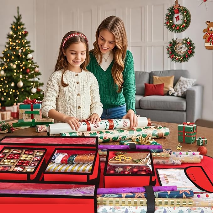 - ALL-IN-ONE ORGANIZER: The front side of these wrapping stations has 2 compartments for rolls of 40-inch gift wrap or craft wallpaper, keeping your unused Christmas, birthday, or wedding gift wrap neat. 4 square bins and pockets for ribbon, small Christmas decorations, an envelope bag, bow, cards, tags, tape, scissors, tissue paper, and everything else. Their backsides each have 2 large pouches for keeping gift bags or flat gift wraps