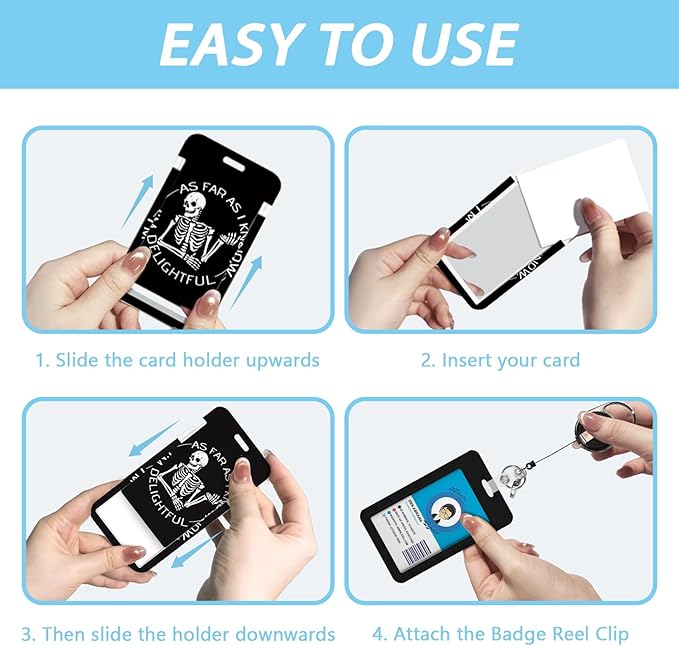 - Novelty Badge Reel: This funny skull badge reel is designed with funny arts: As Far As I Know I'm Delightful. The cute and interesting badge reel will always bring more happiness and fun to your life. You will get tons of comments on it