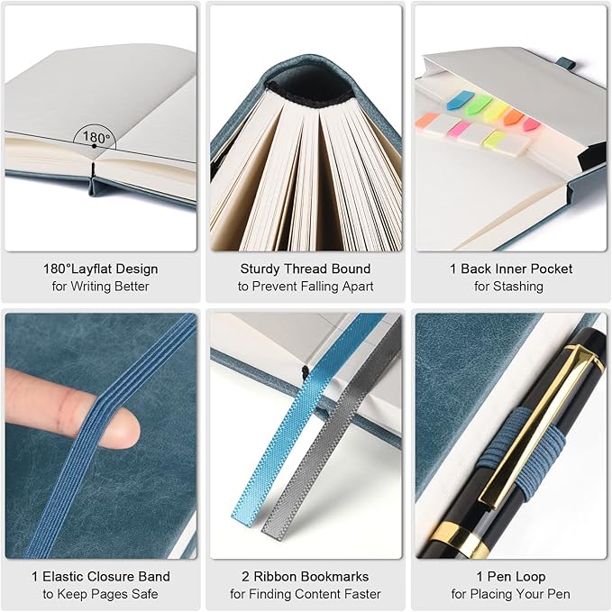 - 【HUMANIZED DESIGN】5 Contents Pages to log more entries. No more worrying about not having enough index pages; 2 Exquisite ribbon bookmarks to help you find content faster; 1 Elastic closure band to keep your pages safe; 1 pen holder to make your pen no longer alone; 1 Back Inner pocket for stashing notes, small gadgets, etc; Rounded corner design makes the lined notebook not easy to be damaged and curled.