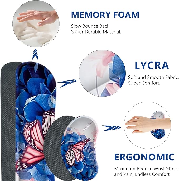 AIMSA Large Gaming Mouse Pad Set, Keyboard Wrist Rest Support Mouse Pad, Ergonomic Memory Foam Multifunctional Extended Desk Mat 35x15.7in Anti-Slip Rubber Base for Office Home, Butterfly Flower