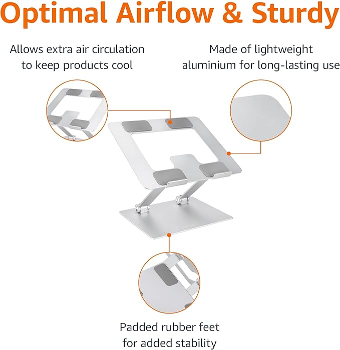 Amazon Basics Sturdy and Portable Ergonomic Laptop Stand for Desk, Adjustable Riser, Fits all Laptops and Notebooks up to 17.3 Inch, Silver, 10 x 8.7 x 6 in