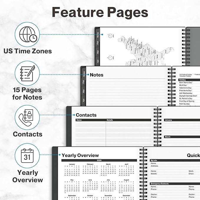 - COMPREHENSIVE ORGANIZATION: 15 note pages, contacts section, storage pockets for loose paper, holiday reference & USA time zones map. Everything needed for work, office and personal life.