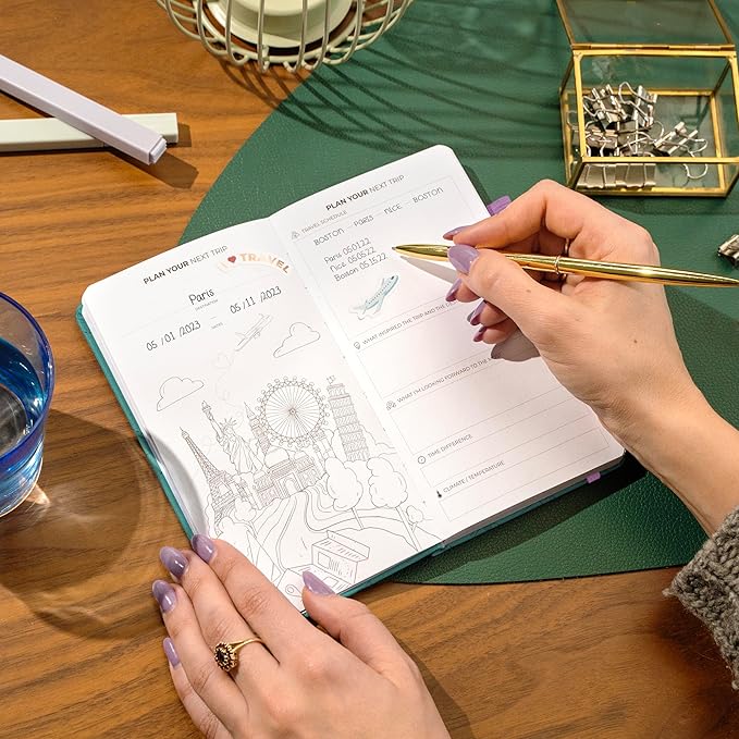 - POCKET FORMAT & PREMIUM QUALITY: This vacation planner measures just 3.9 by 6.9 inches to fit inside a small bag and has an eco-leather hardcover, thick 120gsm paper, pen loop, elastic, bookmark, pocket for loose notes, stickers, and user guide.