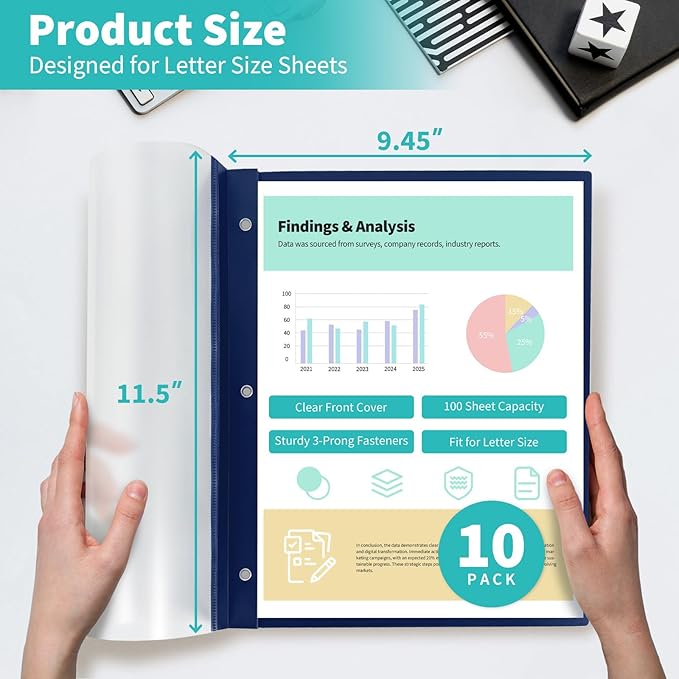 - 【10 Pack for Letter Size】 These report covers with 3 prongs fit 8.5" x 11" documents and come in a reusable 10-pack, ideal for class assignments, business reports, or daily filing. Reinforced construction ensures repeated handling while keeping documents neatly and professionally presented.