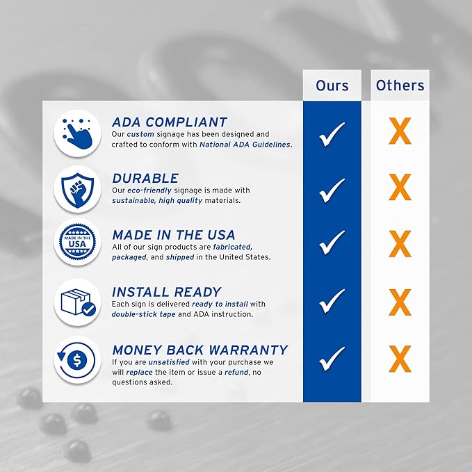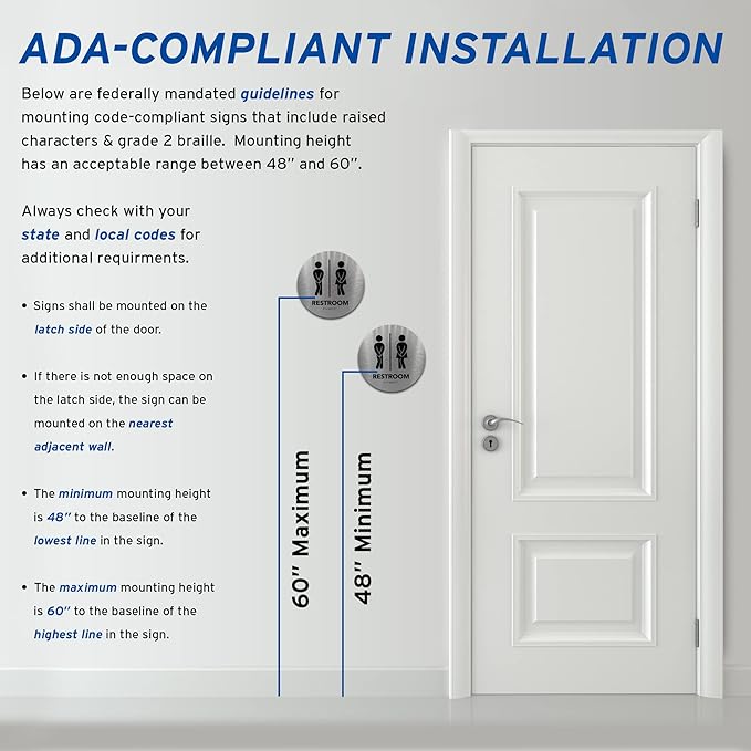 - âś… ADA COMPLAINT & BRAILLE SIGN: Our restroom signs for business are compliant with national ADA and braille reading standards. Where permanent commercial signs are required, a sign should be installed on the wall adjacent to the door handle or latch side of the door. These ADA bathroom signs should be hung 48 to 60 inches between the finish of the floor and the bottom of the last line of copy on the sign.