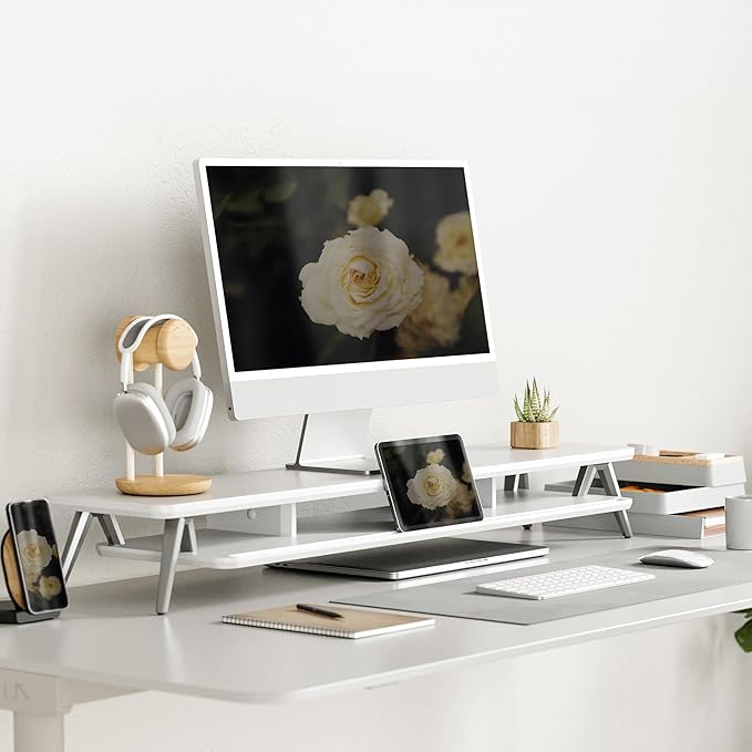 - 【2 TIER DESKTOP ORGANIZER】At longest 42.5inch wide,longer size with more space. This laptop riser is big enough to support two monitors. It has 1 universal device holder slot and 3 high capacity compartments. You can easily store your office accessories & supplies under your monitor stand to keep your desktop tidy. Our monitor stand rise comes with cable management slots that can make your cord stay organized.