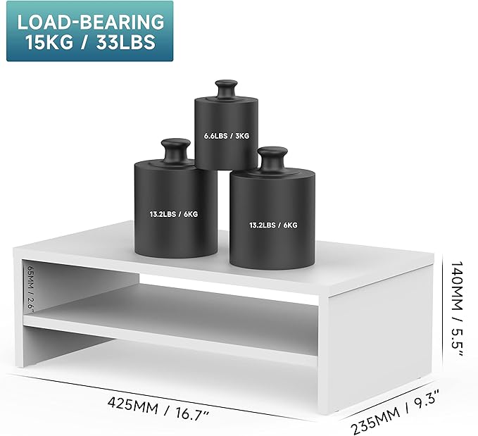- 【Anti-slip Legs for Stable Stand】The laptop monitor stand is made of 15mm MDF for a beautiful appearance and easy to keep clean. Rubber skids on the bottom of the legs prevent the stand from sliding freely. Tough enough for printers, laptop, desktop or any other type of heavy equipment.
