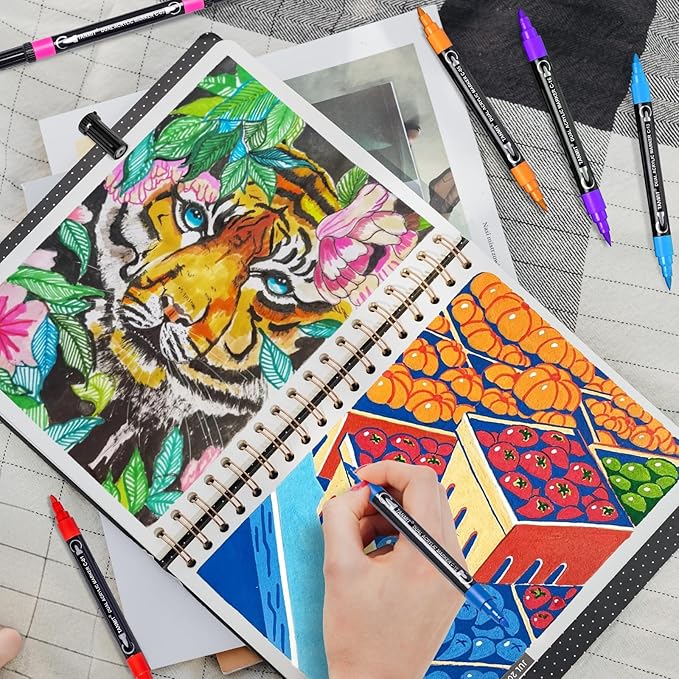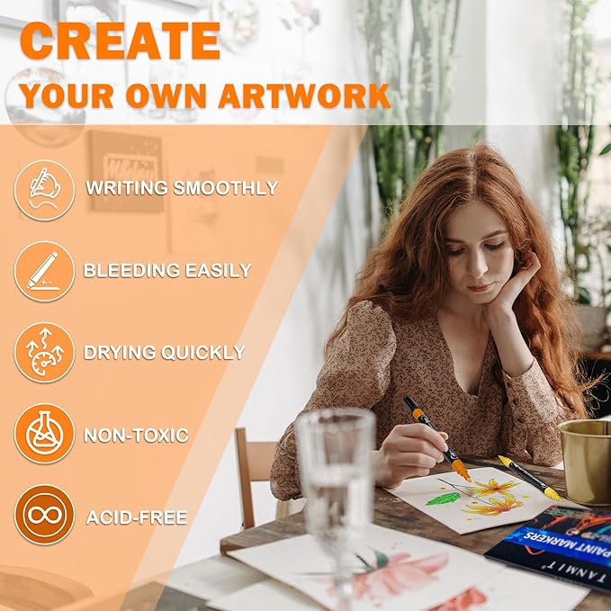 - VERSATILE DUAL TIP: Our acrylic paint markers come with a unique dual-tip design. One end features a 1mm fine tip for outlining and detailing intricate designs, while the other end has a 0.5-5mm broad tip for large areas of painting and coloring, allowing you to create different strokes by changing the brush pressure, saving the trouble of changing nibs, and bringing more convenience to your creation, meet the different needs of professionals and amateurs.