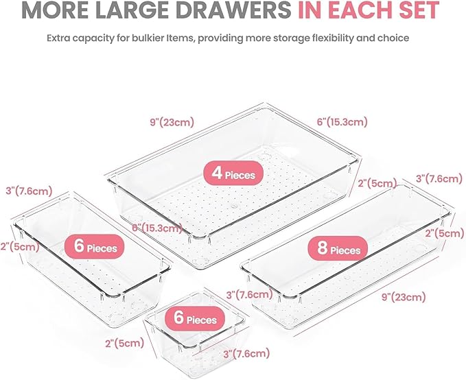 - Drawer Organization And Storage: Our vanity organizer has more pieces of large drawer organizer bins than others, provide ample space for bulkier items. This set of acrylic organizers comes in multiple sizes and quantities, allow you to create your own personalized storage solutions that fit your unique needs.