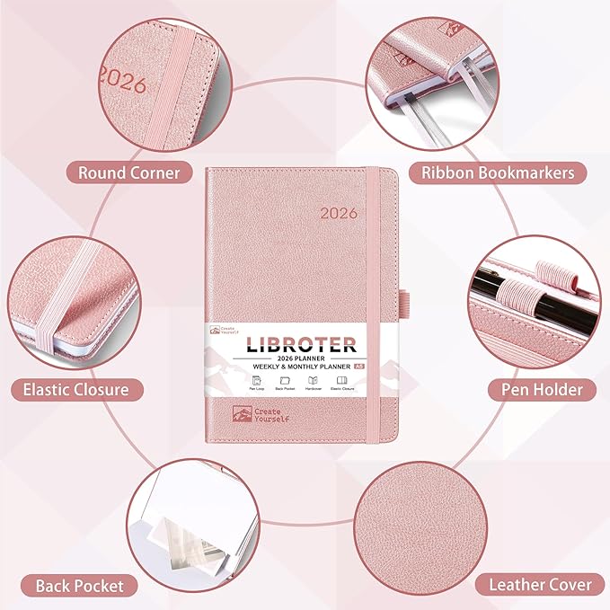2026 Planner - Planner 2026, 2026 Weekly Monthly Planner, Jan.2026 - Dec.2026, 5.7'' x 8.4'', Thick Paper, Leather Cover, Pen Holder, Back Pocket, Bookmarks, Perfect Daily Organizer - Rose Gold